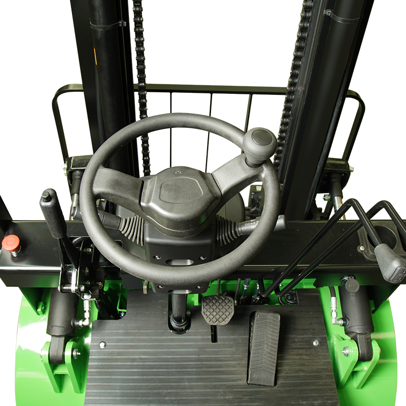 • Ergonomic Operator Comfort: The cabin is designed for all-day productivity, featuring a deluxe suspension seat, a low-torque steering wheel, centralized controls, and convenient amenities like dual USB fast-charging ports. The wide-view mast and optimized fork carriage offer excellent visibility and a spacious operating environment.