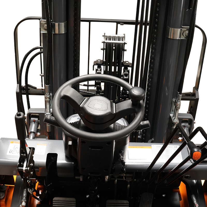 ✅ Ergonomic Operator Cabin: Compact steering wheel, tilting column, and optimized control layout